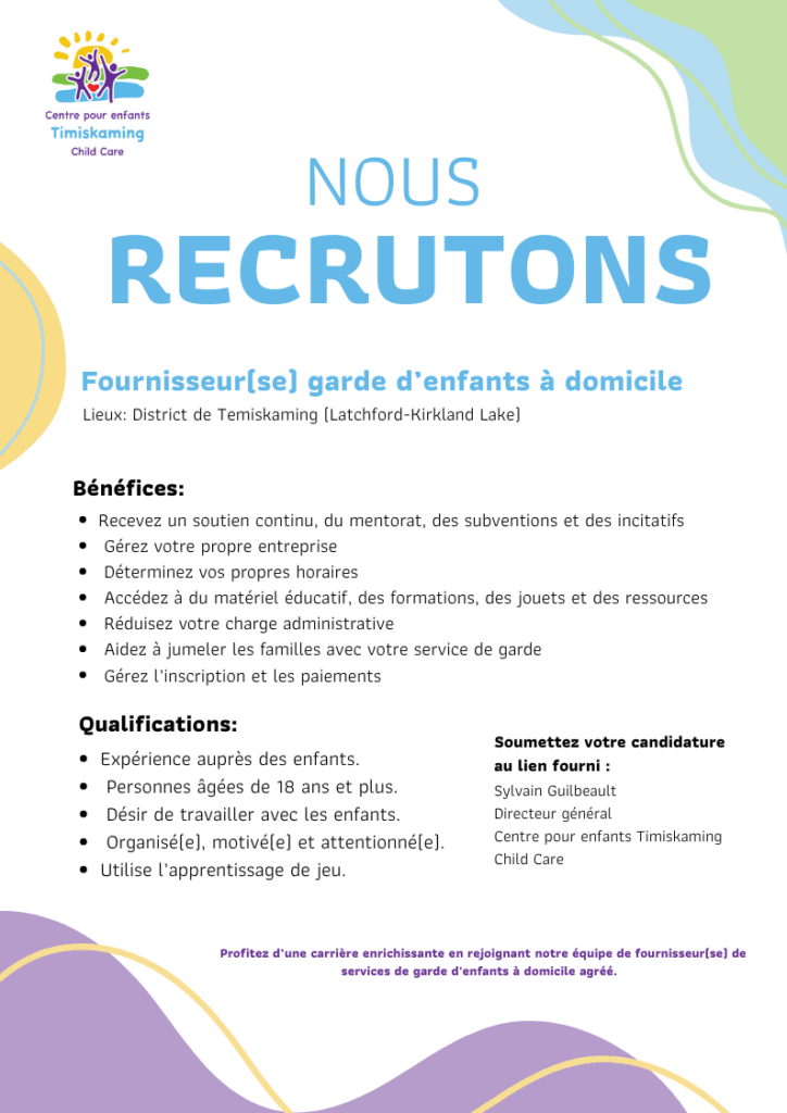 Une aide financière pour les frais de garde d’enfants peut être offerte aux familles admissibles par le Conseil d’administration des services sociaux du district de Timiskaming.