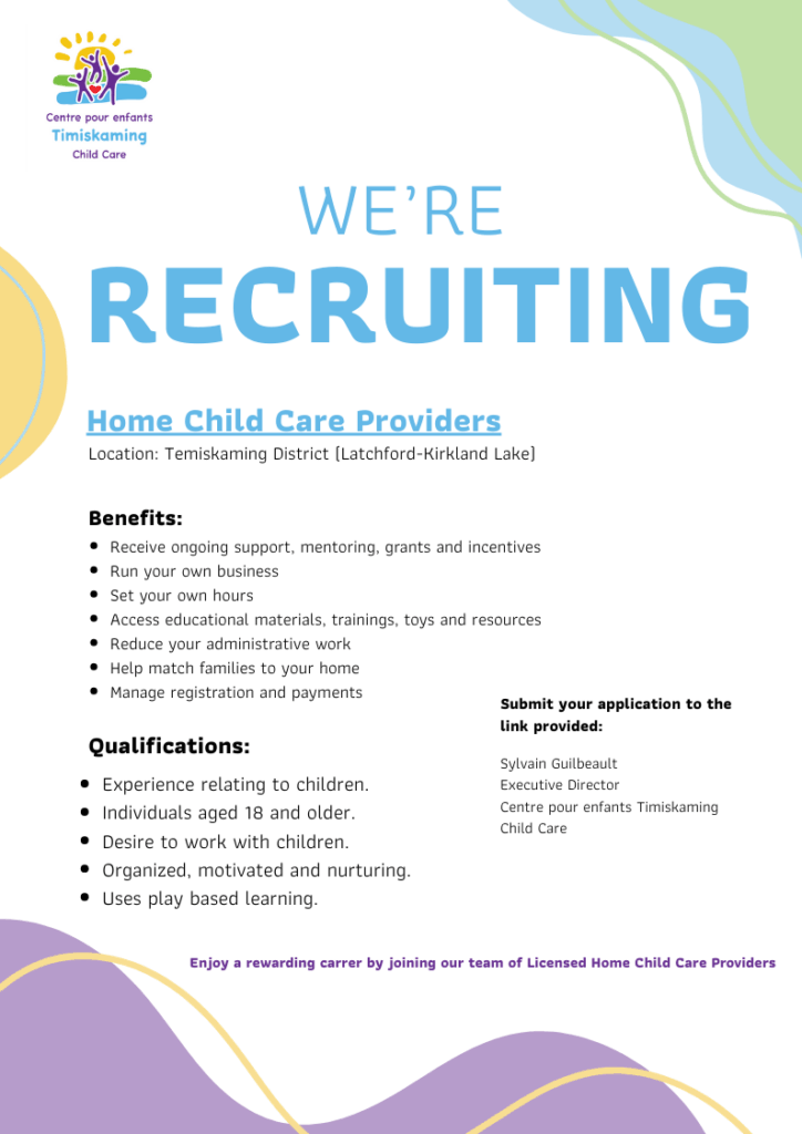 Financial assistance with child care costs may be available for eligible families through the local District of Timiskaming Social Services Administration Board.